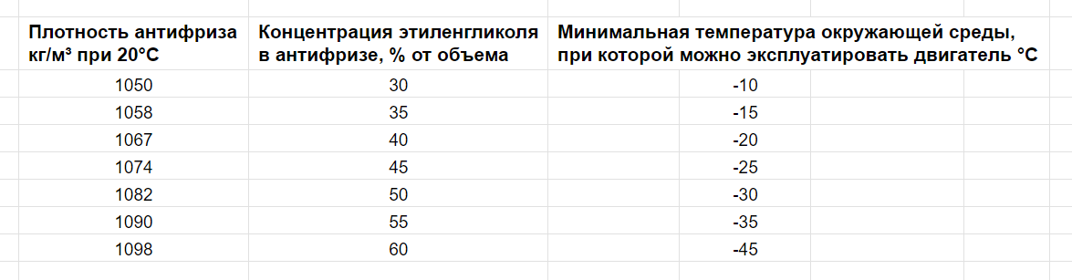 5. Based on the table, according to the density of the Hyundai coolant, get ahead of the concentration and minimum temperature at which it can be used.