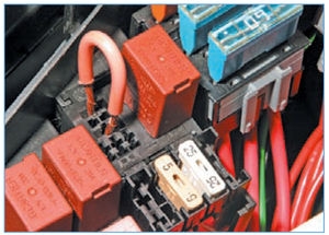 Помощник на 2–3 с перемыкает отрезком провода гнезда «3» и «5» реле — при этом включится топливный насос.