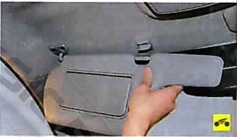 Противосолнечный козырек может выводиться из держателя поворотом на шарнире вбок.