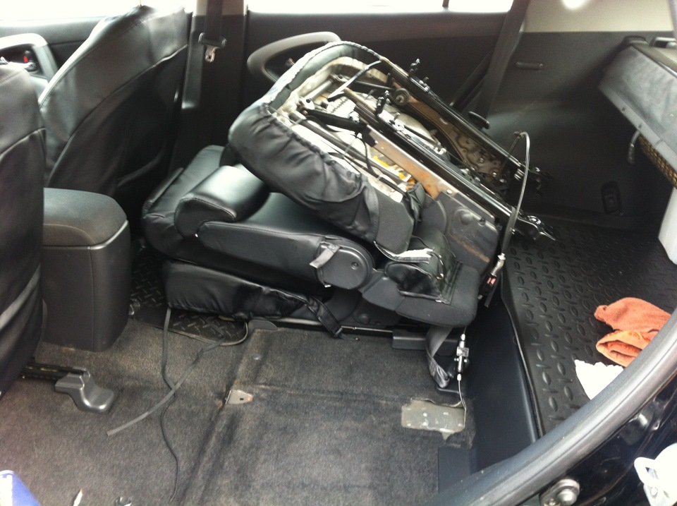 2. Сдвиньте заднее сиденье до упора вперед, вдавите подголовники и опустите вниз. Снимите руками задние декоративные накладки салазок сиденья, плавно потянув их на себя. При помощи торцевой головки на 14, открутите два болта крепления. Для удобства откручивания пригодится удлинитель 20-25 см.