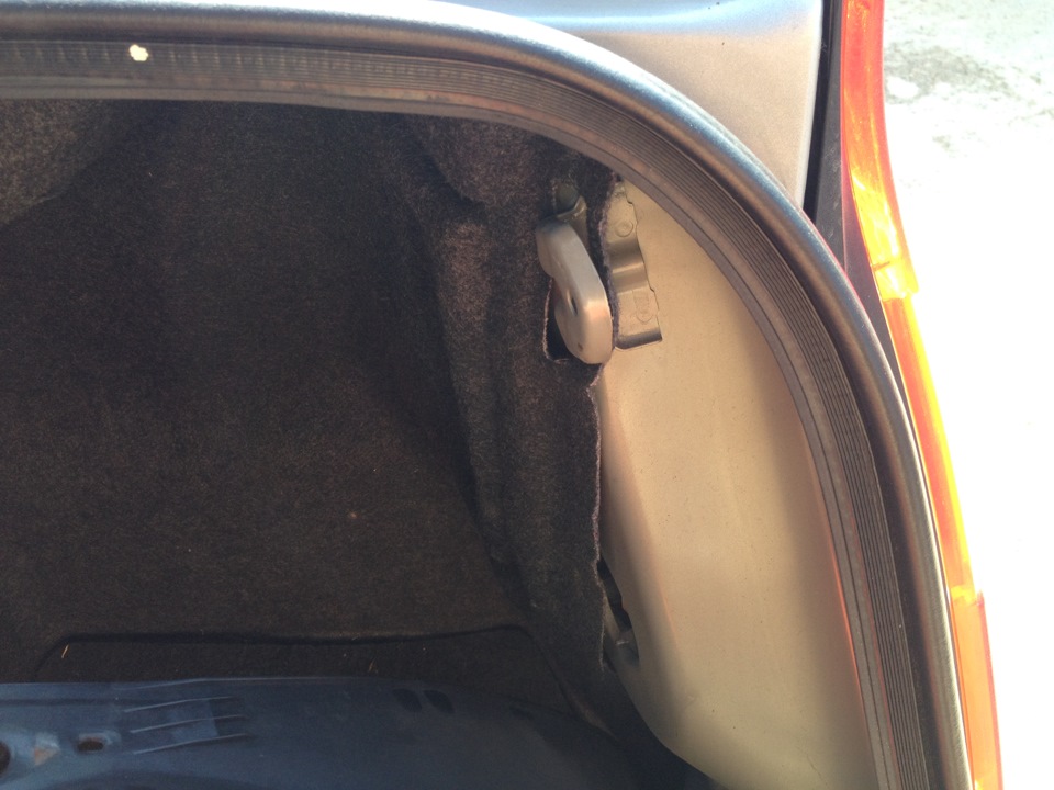 4. Отгибаем пластик рядом с правым фонарем и снимаем с ушка обивку. Отгибаем ее.