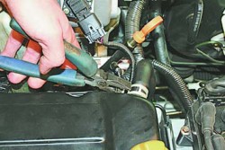15. Сожмите отогнутые усики хомута крепления подводящего шланга системы вентиляции картера, сдвиньте хомут по шлангу... |