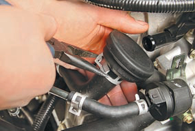 1. Ослабьте хомут крепления отводящего шланга системы вентиляции картерных газов к патрубку крышки головки блока цилиндров, сжав пассатижами его отогнутые ушки.