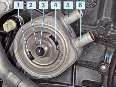 Детали теплообменника автомобиля Рено Дастер (изображено при демонтированном масляном фильтре): 1 - канал подачи масла к фильтру; 2 - штуцер фиксации масляного фильтра и теплообменника к блоку цилиндра; 3 - канал отвода масла из фильтра; 4 - канал с обратным клапаном подачи масла к фильтру; 5 - патрубок подачи охлаждающей жидкости к теплообменнику; 6 - патрубок отвода охлаждающей жидкости из теплообменника