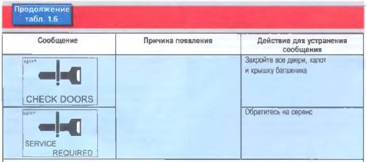На дисплей в информационном поле, кроме маршрутной информации (рабочие параметры двигателя, остаток топлива в баке и пр.), выводится и предупреждающая информация (табл. 1.6).