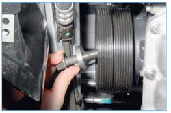 Для замены зубчатого ремня привода ГРМ снимаем ремень привода компрессора кондиционера и ремень привода вспомогательных агрегатов.