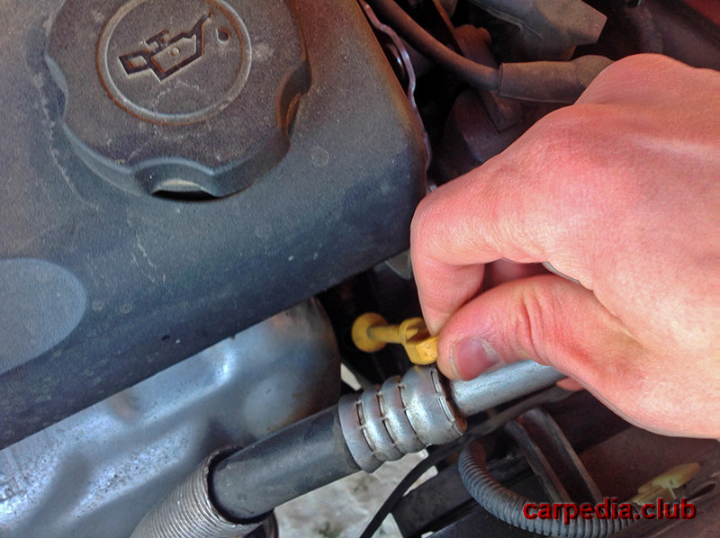 1. Установите автомобиль на ровную горизонтальную поверхность. Откройте капот и зафиксируйте его в поднятом положении. Указатель (щуп) уровня масла с желтым пластиковым наконечником расположен в передней левой части блока цилиндров.