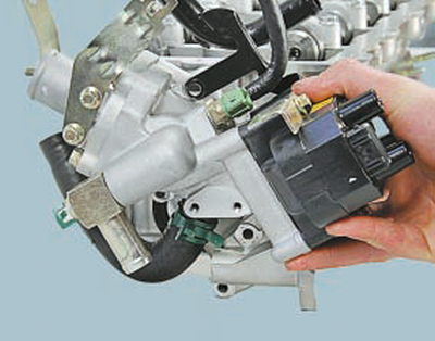 5. Снимите корпус термостата (в сборе с катушкой зажигания) и установленную под ним прокладку.