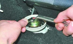 12. Установите амортизаторную стойку в порядке, обратном снятию. Гайки верхнего и нижнего креплений стойки окончательно затягивайте на автомобиле, стоящем на земле.