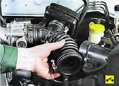 4. Ослабьте затяжку хомута крепления воздухоподводящего рукава к дроссельному узлу.