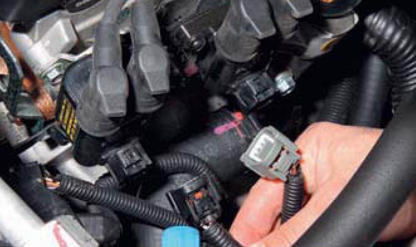 2. Нажав фиксатор колодки (серого цвета) жгута проводов системы управления двигателем, отсоедините колодку жгута проводов от разъема катушки зажигания 1-го и 4-го цилиндров.