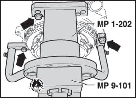 10. Для осуществления сборочных работ необходимо закрепить двигатель с устройством для снятия и установки двигателя и коробки передач (МР1202) (при помощи 3-х болтов (стрелки)) на сборочном стенде -МР 9-101-, как показано на рисунке ниже.