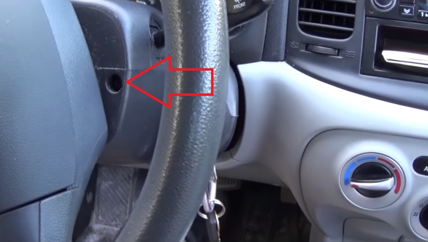 2. Поверните рулевое колесо влево, чтобы открыть доступ к саморезу крепления кожуха рулевой колонки, и открутите его.