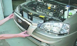 2. Подденьте отверткой левую нижнюю часть декоративной облицовки радиатора и выведите фиксаторы из держателей на бампере, аналогично отсоедините фиксаторы с правой стороны.