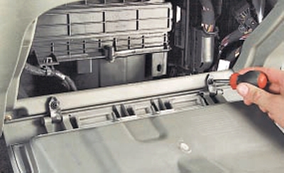7. Отсоедините накладку от панели приборов, преодолевая сопротивление ее держателей вверху и по бокам.