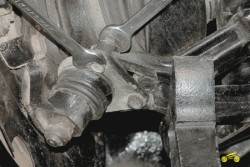 14. Сожмите пружину подвески, приподняв домкратом нижний рычаг. Отверните три гайки и выньте из рычага болты шаровой опоры.
