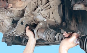 15. Аккуратно выведите хвостовик наружного шарнира равных угловых скоростей из ступицы переднего колеса, отведя амортизаторную стойку в сторону.