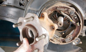 14. Отвернув четыре болта крепления с обратной стороны щита тормозного механизма, снимите ступицу заднего колеса.