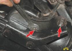 4. Отверните две гайки скобы подушки стабилизатора и снимите скобу.