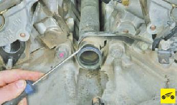 - 14. Подденьте отверткой и снимите уплотнительное кольцо с патрубка, при сборке замените кольцо новым.