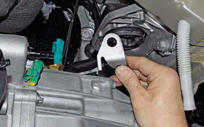 Отводим держатель жгутов проводов со жгутами от коробки передач.
