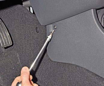 Ключом Torx T-20 отворачиваем с каждой стороны по одному саморезу бокового крепления облицовки туннеля пола.