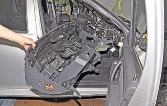 Снимаем уплотнитель двери водителя с отбортовки кузова в зоне передней стойки и панели приборов.
