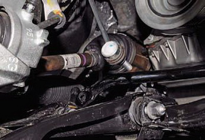 С обеих сторон автомобиля отсоединяем рычаги передней подвески от подрамника.