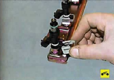 5. Извлеките хвостовик форсунки из отверстия рампы. Аналогично снимите остальные форсунки.