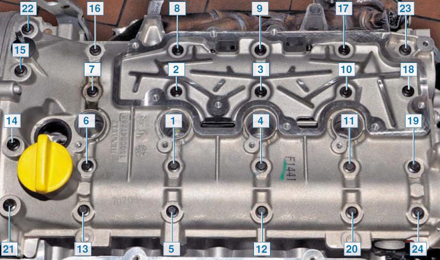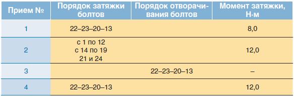 Устанавливаем крышку головки блока цилиндров и затягиваем болты ее крепления предписанным моментом в последовательности, указанной в таблице.
