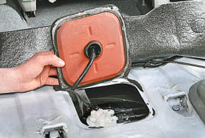 3. Откиньте заднее сиденье и снимите обивку пола, прикрывающую люк в основании кузова над топливным модулем.