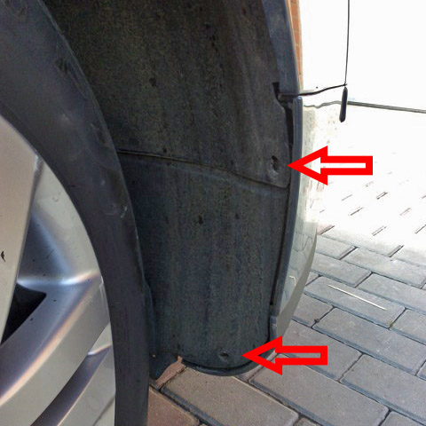 3. Освободите частично передние подкрылки слева и справа. Для этого нужно открутить винты спереди внизу колесной арки. Колеса для этого снимать не обязательно, достаточно поворачивать их рулем для более удобного доступа.