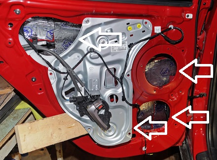 3. Снимите стеклоподъемник или открутите пять болтов крепления модуля задней двери (расположение болтов показано белыми стрелками). Вставьте в отверстие дощечку 25 мм. (либо пластиковую бутылку), чтобы пролезали руки.