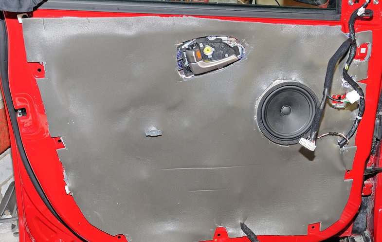 6. В качестве первого слоя используется вибропласт. Обезжирьте места на которые будете наносить вибропласт. Вырежьте подходящие куски вибропласта, нагрейте их техническим феном. Нанесите на дверь и прикатайте валиком вибропласт. Установите динамик на место.