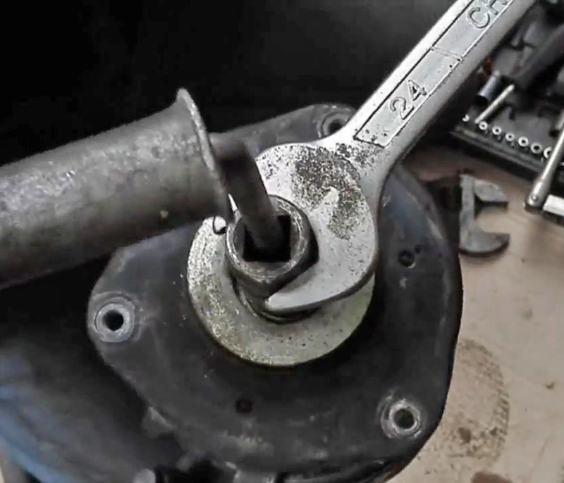 Откручивание центральной гайки переднего амортизатора Volkswagen Passat B6 2005-2010