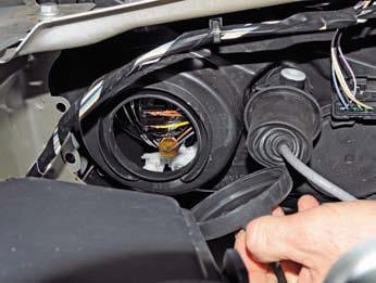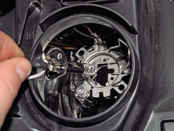 Выводим лампу из зацепления с тремя пружинными фиксаторами (для наглядности показано на снятой блок-фаре).
