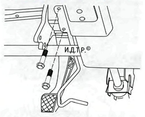 7. Выверните два винта и снимите предохранительную опору перед педалью сцепления.