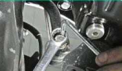 21. Ослабить крепежный хомут промежуточной трубы и дополнительного глушителя выхлопной системы, и затем открутить гайки и извлечь болты из хомута.