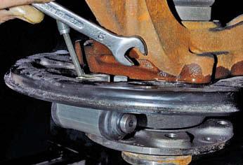 Головкой или ключом «на 10» отворачиваем болт крепления цилиндра к щиту тормозного механизма…
