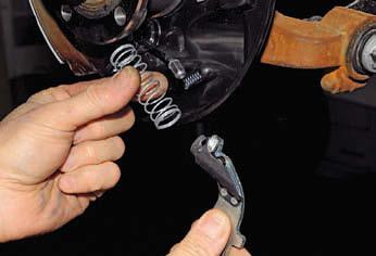 Поддев отверткой, выводим из зацепления с колодкой крючок верхней стяжной пружины…