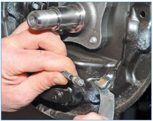 Перед установкой барабана тормозного механизма очищаем его рабочую поверхность металлической щеткой от грязи и продуктов износа колодок. Гайку крепления подшипника ступицы колеса заменяем новой и затягиваем предписанным моментом. Аналогично заменяем колодки тормозного механизма правого колеса (резьба на наконечнике распорной планки и храповой гайке — правая).