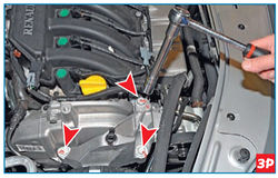 3. Подставляем под картер коробки передач через деревянный брусок регулируемый упор (например, домкрат). Головкой на 16 отворачиваем три болта крепления кронштейна опоры к коробке передач.