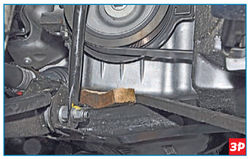 2. Подставляем под поддон картера через деревянный брусок регулируемый упор (например, домкрат). Без использования регулируемого упора можно монтажной лопаткой слегка приподнять правую сторону двигателя (за поддон картера, опираясь лопаткой на подрамник) и вставить между подрамником и поддоном картера деревянный клин.