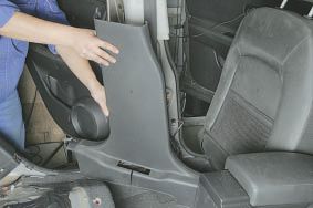 4. Сдвиньте переднее сиденье максимально вперед. Преодолевая сопротивление фиксаторов, отсоедините от центральной стойки нижнюю часть облицовки стойки кузова.