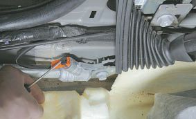 22. Подденьте отверткой фиксатор колодки проводов пиропатрона преднатяжителя…