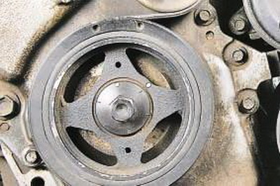 4. Удерживая шкив коленчатого вала от проворачивания, выверните болт крепления шкива коленчатого вала не более чем на 10 15 мм