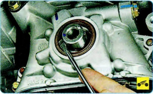 10. Поддев отверткой, извлеките сальник из блока цилиндров двигателя.
