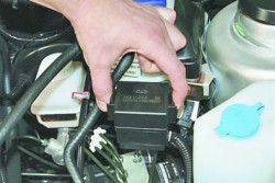 12. Для получения доступа к предохранителям и реле электровентиляторов системы охлаждения сожмите фиксаторы...