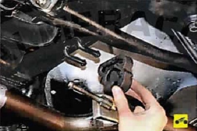 4. Придерживая приемную трубу и основной глушитель, снимите подушку их подвески и приемную трубу с дополнительным глушителем с автомобиля.