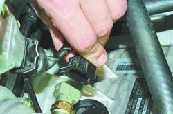 9. Отсоедините колодку жгута проводов от вывода датчика температуры охлаждающей жидкости.